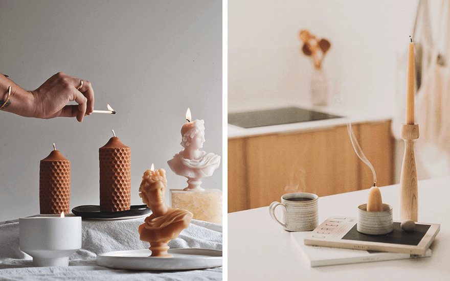 Аромасвечи служат не только для того, чтобы зажигать их во время романтического ужина. Они позволяют создать в доме нужное настроение в зависимости от аромата, который источают при зажигании. К примеру, лаванда, жасмин и ветивер успокаивают, а лайм, грейпфрут, розмарин и роза, наоборот, бодрят. Более того, аромасвечи, расставленные на на полках стеллажей, журнальных столиках или на подоконнике, смотрятся красиво и добавляют уюта, особенно если у них необычная форма или подсвечник.