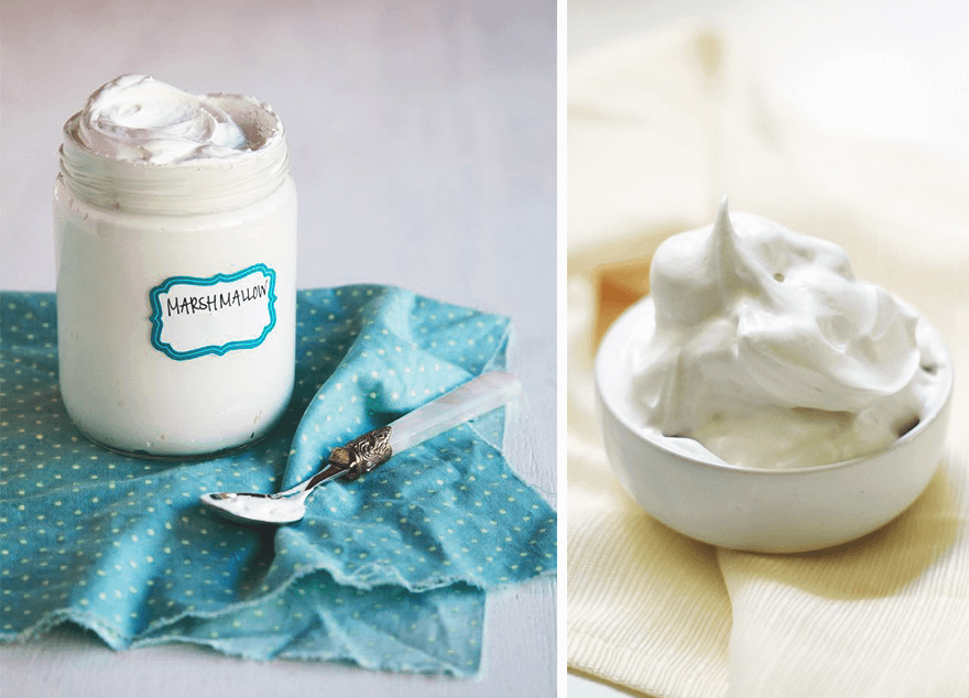 Добавь яичные белки и лимонный сок в чашу миксера — взбивай до образования пышной пены. Проверяем сироп на готовность: если его температура достигла 120 градусов, то карамель готова. Тонкой струйкой влей сироп во взбитые белки, должна получиться густая масса. Добавь ванильный экстракт, сахарную пудру и перемешай — кремовый маршмеллоу готов.