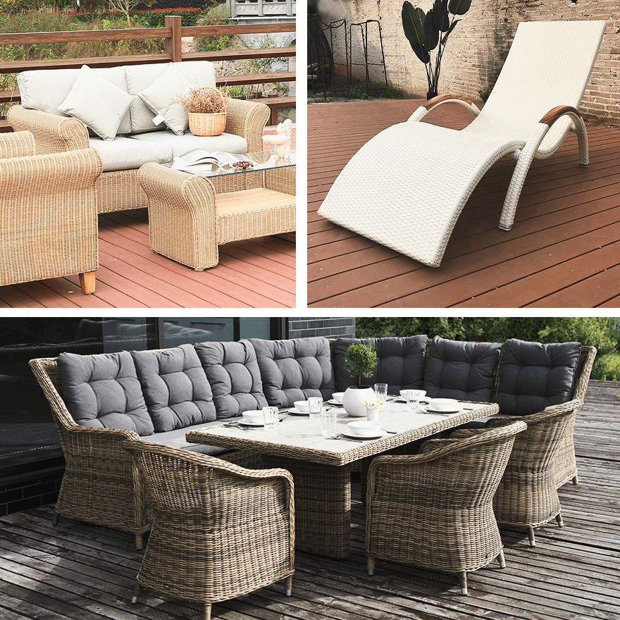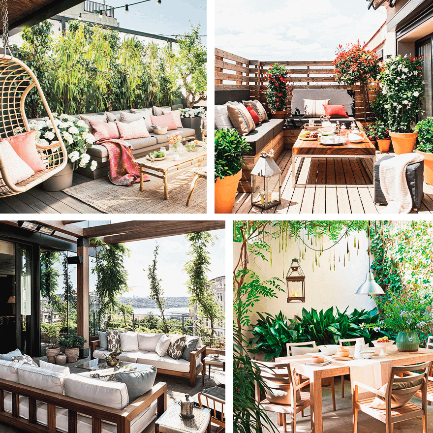 Стильная мебель из искусственного ротанга превратит террасу в уютное место для отдыха и общения. Материал привлекает не только своей красотой, но и практичностью: его легко мыть, он не портится от влажности и прямых солнечных лучей, а если терраса открытая, то такую мебель легко занести в дом во время дождя. Все, что тебе понадобится, — стол с обеденными стульями, если собираешься проводить на террасе больше времени с друзьями, или шезлонг с обеденным столиком чисто для себя. Дополнить мебель можно парой мягких подушек и пледом с интересным принтом.