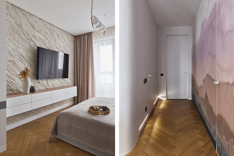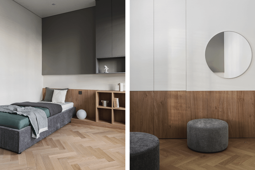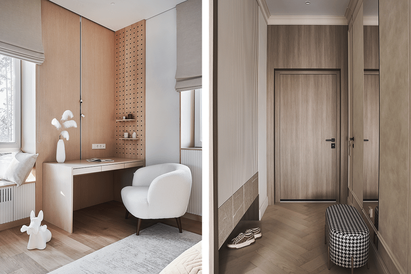 - Скрытые ниши для хранения — визуально расхламляют пространство, сохраняя его целостность.