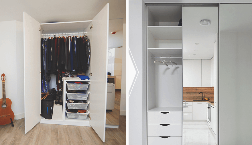Для компактного хранения вещей есть много вариантов — встроенные шкафы, контейнеры. На обувных полках сэкономить место помогут специальные вертикальные подставки, куда поместится сразу две пары обуви. По размеру подставка занимает место как одна пара обуви, поэтому так можно освободить половину пространства на полках. Еще один вариант для хранения обуви — пуф-обувница. Его можно поставить в прихожей или в гостиной. В пуфик вставляется пластиковая конструкция с отделениями, куда можно складывать, например, летние босоножки.