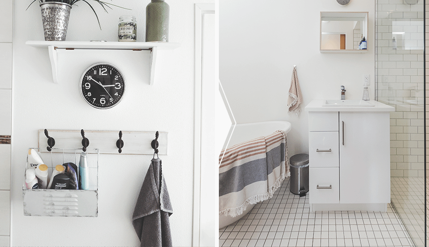 Ванная комната — еще одна головная боль в плане хранения вещей. Полотенца, косметика, чистящие средства — все это легко превращается в нагромождение и сразу бросается в глаза. Чтобы навести порядок и сэкономить пространство, вместо шкафчиков и полок можно повесить рейлинги с прикрепленными к ним плетеными корзинами для полотенец и шампуней. Хранение в корзинах удобно тем, они могут крепиться к стене или шкафчику и смотрятся стильно. А место над дверью подойдет для открытой полки.