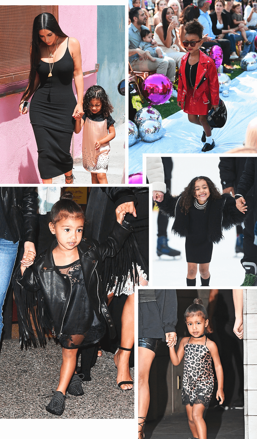 5-летняя дочь Ким Кардашьян и Канье Уэста Норт давно стала маленькой иконой стиля. Родители покупают ей лучшие дизайнерские вещи от Louis Vuitton, Prada, Gucci, Fendi, Balmain и Alexander Wang, создавая не по-детски трендовые образы. У Норт есть свой стилист, но если присмотреться к ее нарядам, во многом можно заметить влияние мамы. Девочку любят наряжать в бархатные и шелковые платья-комбинации, юбки из лакированной кожи, балетные пачки, шубы из искусственного меха и куртки-косухи, сочетая их с меховыми шлепанцами, грубыми ботинками, кедами или кроссовками. Кроме того, Норт любит заимствовать у Ким многие аксессуары, например чокеры, поэтому заказывая украшения, звездная мама всегда делает два экземпляра.