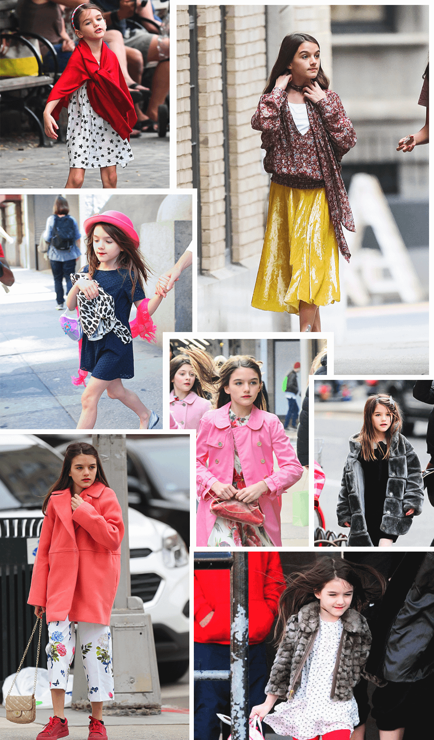 Дочь Кэти Холмс и Тома Круза может похвастаться завидным гардеробом, изобилующим такими брендами, как Burberry, Stella McCartney и Marc Jacobs. В отличие от Шайло, Сури с самого детства предпочитала женственные летящие платья, элегантные пальто и шляпки, меховые шубы, а также позолоченные, серебристые босоножки на каблуках или лаковые сандалии. Сегодня девочке 13, но в ее гардеробе по-прежнему мало брюк. В вопросе одежды Сури не спрашивает советов матери и смело сочетает балетки с бриджами и плюшевыми олимпийками, а кеды с шифоновыми платьями, блузами в стиле бохо и бархатными юбками миди.