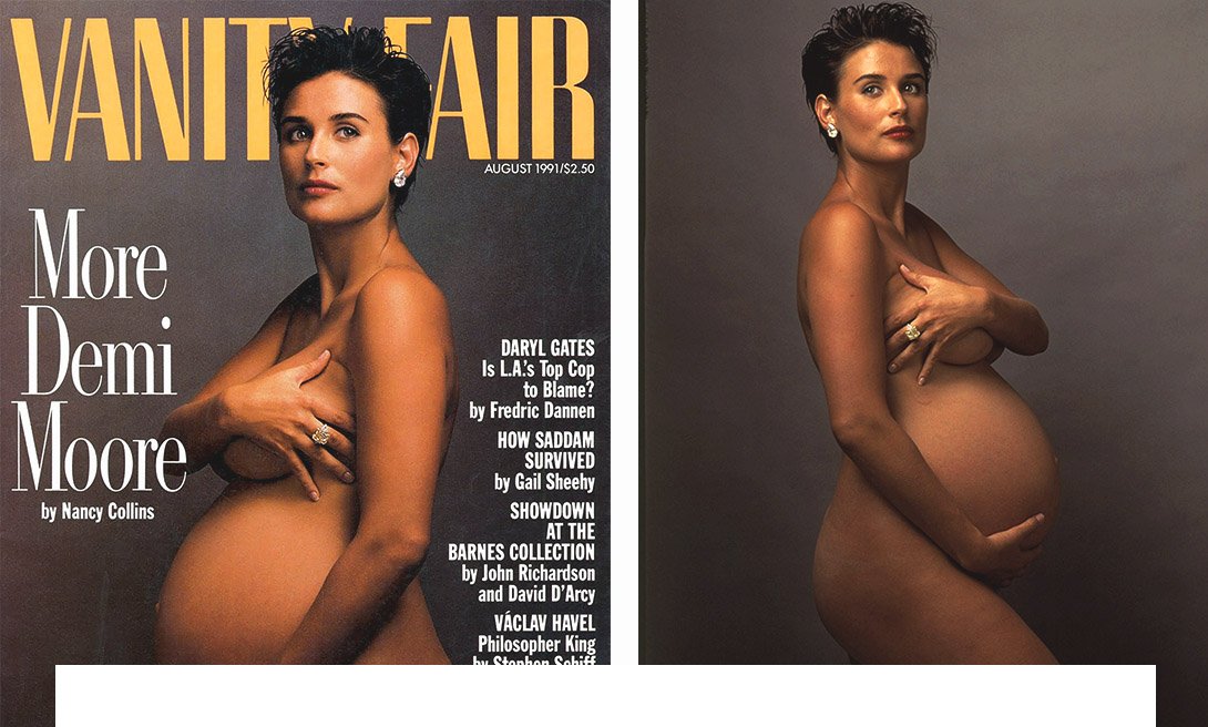 Беременная Деми Мур на обложке Vanity Fair в 1991 году была настоящим скандалом. Большинство читателей были возмущены этим ходом, и журнал потерял значительную часть подписок. Это явно сигнализирует о том, что в то время образ женского беременного тела являлся табу. Даже в нулевых при съемках клипа «Music» Мадонны, режиссер заявил о том, что они не хотели демонстрировать ее беременность в роликах, так что им приходилось выбирать определенные ракурсы.