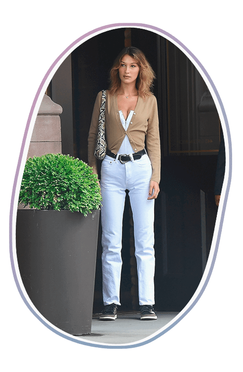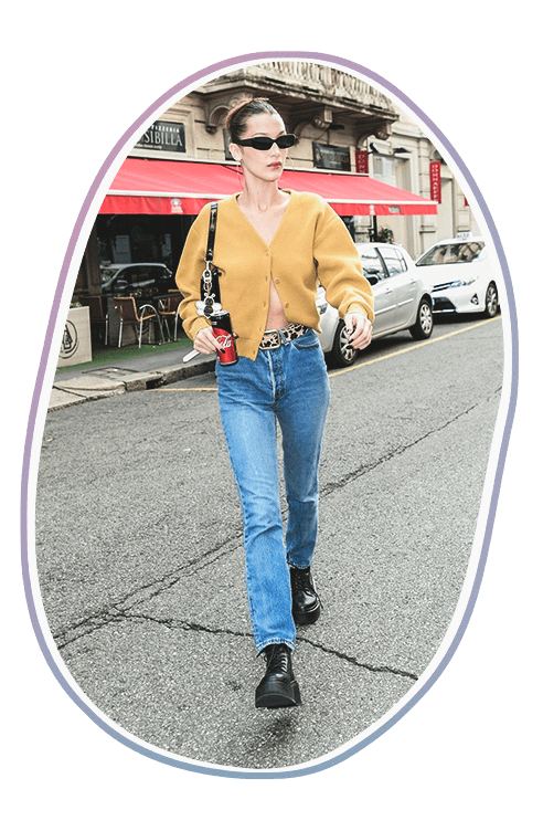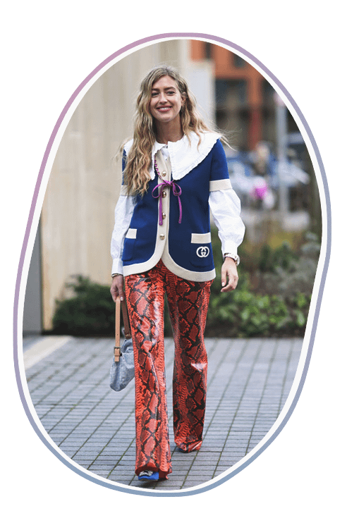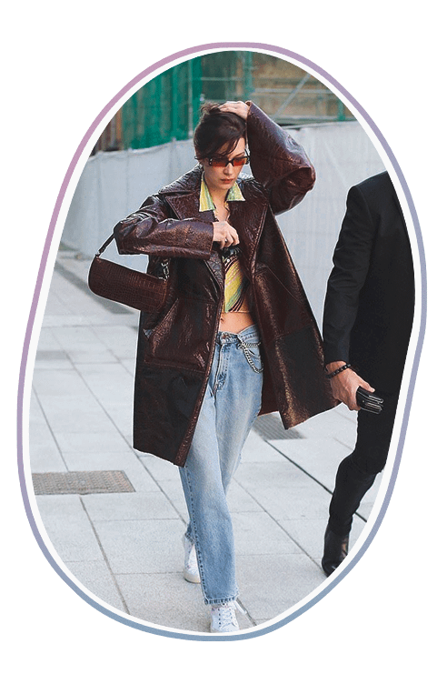 Трикотажные кардиганы – один из главных трендов этого сезона. Винтажные модели чаще всего изготовлены из тонкого трикотажа и облегают фигуру. Особенно популярны модели, застегивающиеся на маленькие пуговицы. В тренде как однотонные кардиганы, так и модели с вышивкой. Модель Белла Хадид – большая любительница винтажных магазинов, предпочитает носить кардиганы с прямыми джинсами на средней посадке. В качестве аксессуаров она использует сумку-багет с актуальным в этом сезоне змеиным принтом.