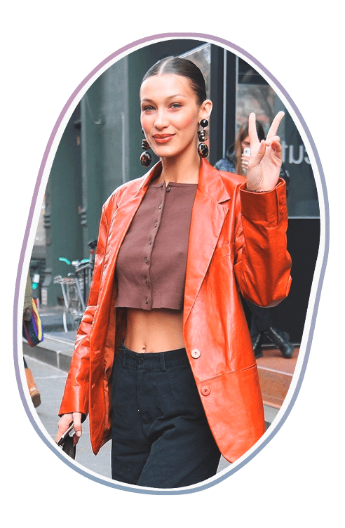 Хочешь стильно носить такой пиджак — вдохновляйся образами Ванессы Хадженс. Актриса сочетает кожаный пиджак с оверсайз футболкой с принтом и светло-голубыми джинсами. А модель Белла Хадид отдает предпочтение ярко-оранжевому кожаному пиджаку и сочетает его с джинсами с низкой посадкой и укороченным кардиганом.