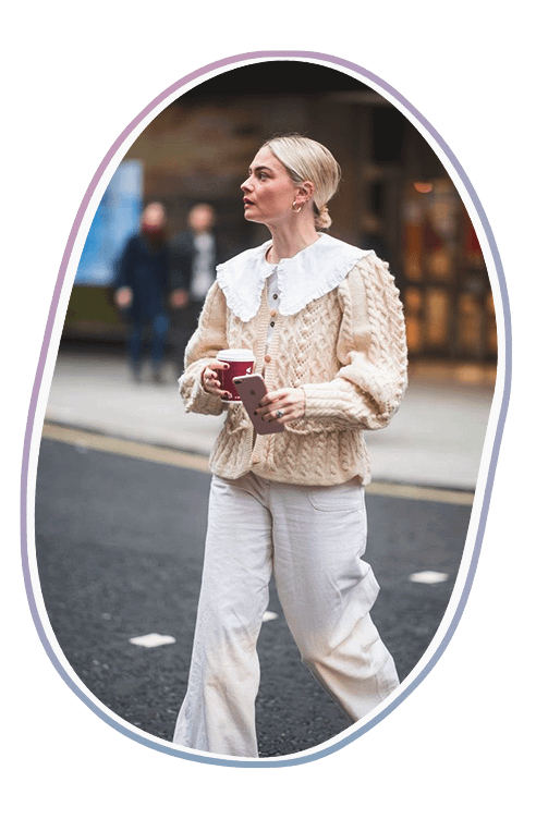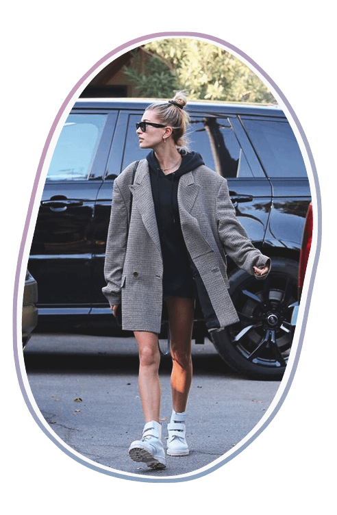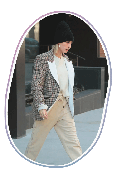 Винтажные пиджаки в этом сезоне особенно популярны. Они хорошо вписываются не только в классические образы в стиле 90-х, но и могут стать акцентной деталью повседневного лука. Так, модель Хейли Бибер широкие винтажные пиджаки сочетает в одном образе с теплой трикотажной кофтой и джоггерами. В качестве аксессуаров она использует базовую черную шапку и крупные серьги-кольца.