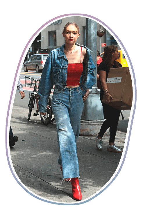 Курки из плотного денима были актуальны во все время. Универсальная вещь подходит для создания как повседневного, так и более яркого образа. Винтажные джинсовые куртки обычно имеют оверсайз крой. Чаще всего они изготовлены из классического голубого денима и имеют укороченную длину. Модель Джиджи Хадид на своем примере показывает, как сочетать винтажную джинсовую куртку в одном образе с ярким топом на бретелях и актуальными в этом сезоне широкими джинсовыми штанами на низкой посадке.