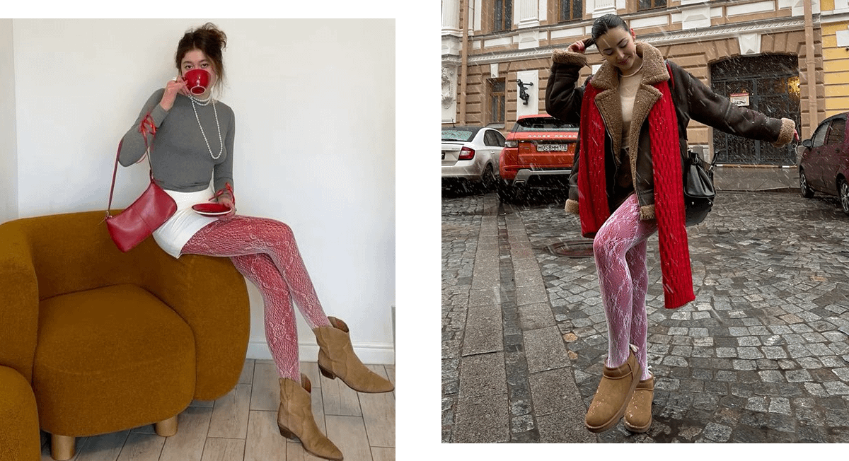 Соедини в одном образе обтягивающий лонгслив или бадлон, мини-юбку и ажурные колготки. Они могут быть белыми, черными или красными. В цвет колготок подбери другие аксессуары: сумку, украшения для волос, шарф. Обувь можешь выбрать любую. Подойдут как туфли на каблуках, так и комфортные угги.