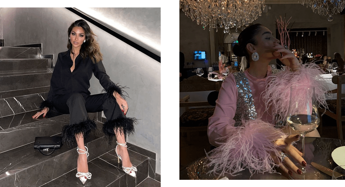 Например, брюки с перьями можно носить вместе с белой рубашкой, жакетом, шелковой блузкой или обычной футболкой. Костюмный верх идеально впишется в образ с блестящей юбкой, акцентными брюками и кожаными штанами. Экспериментируй с тем, что уже есть в твоем гардеробе, и вдохновляйся смелыми образами модных инфлюэнсеров.