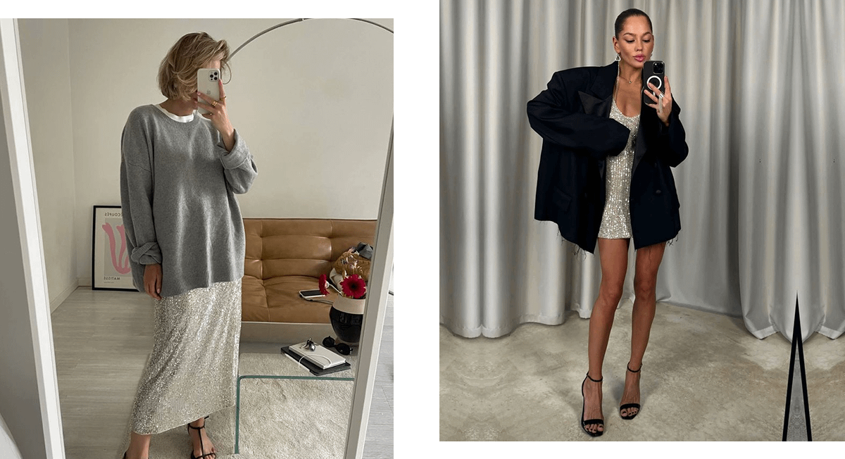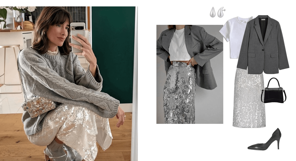 Возможно, в твоем гардеробе уже есть обычная белая футболка и стильный серый жакет. Добавь к этому дуэту юбку-миди или макси с пайетками. Идеально подойдет модель в металлическом оттенке.