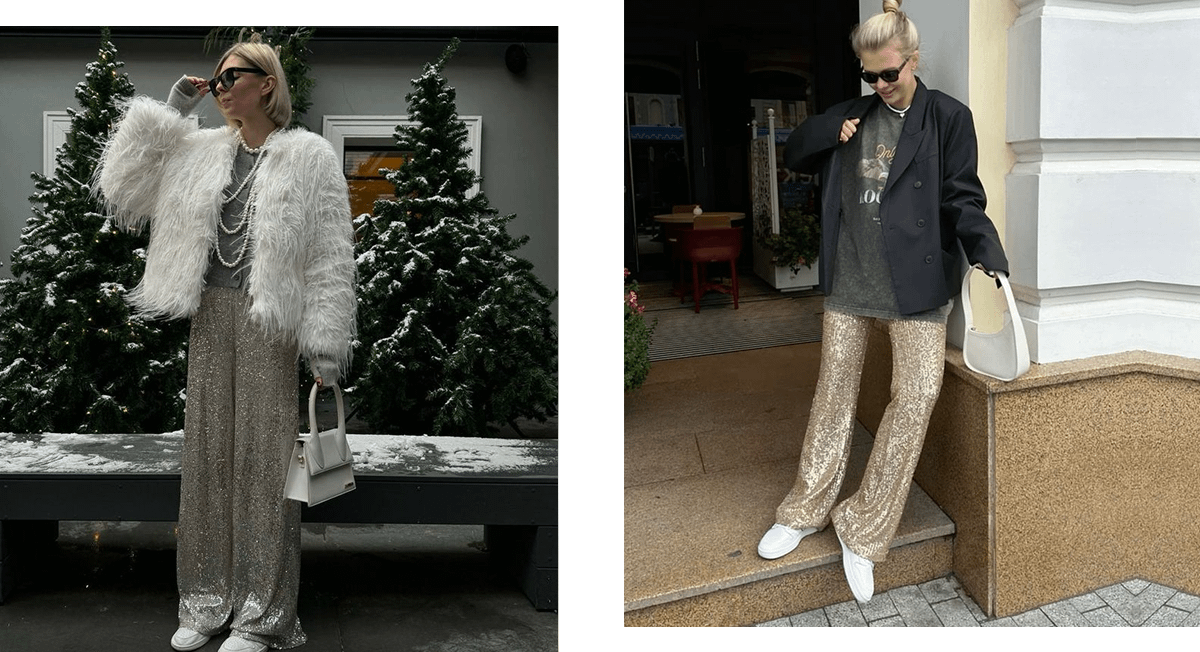 Не любишь носить юбки? Тогда примерь тонкие широкие брюки, усыпанные пайетками. Они идеально впишутся в образ с однотонной или украшенной необычным рисунком футболкой. Дополнительно утеплись черным или серым жакетом. Идеально впишется в образ и укороченная шуба. Надень под одежду термобелье, если собираешься выйти на длительную прогулку.