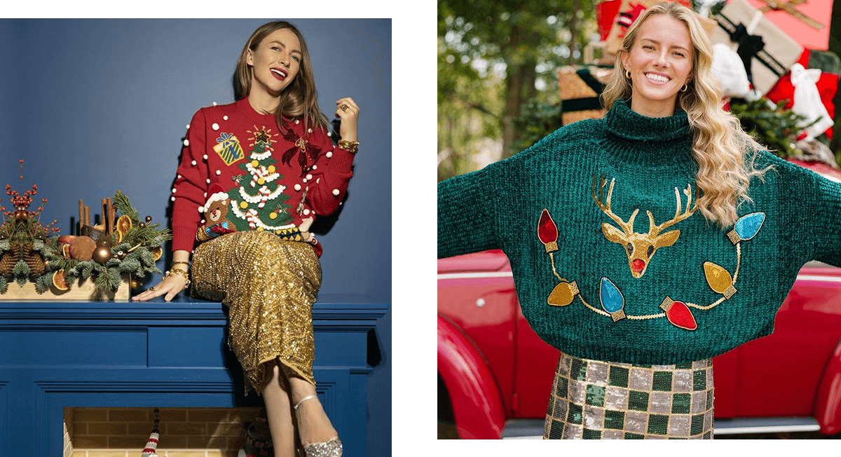 В сочетании с базовыми джинсами и кедами свитеры, украшенные рисунками с новогодней тематикой, выглядят очень просто. Если хочешь подчеркнуть женственность и статусность, носи праздничный свитер в образе с яркой юбкой, украшенной пайетками или камнями. Заверши образ туфлями на каблуках.