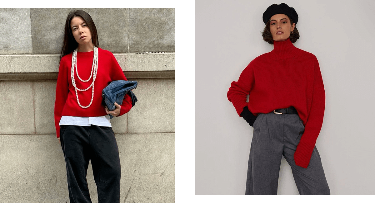 Например, можешь надеть базовые черные или серые брюки, белую футболку и любимый красный свитер. Усложнить образ помогут бусы, акцентные серьги или берет.