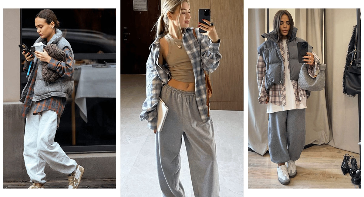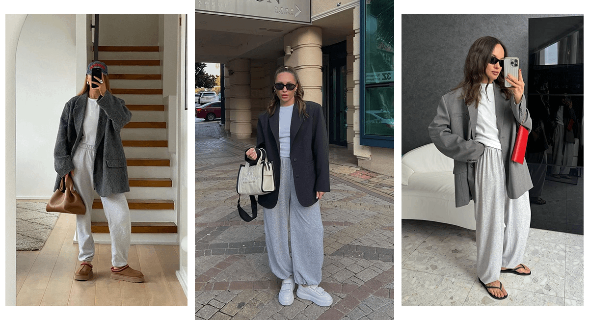 Впиши серые спортивные штаны в образ с серым пиджаком