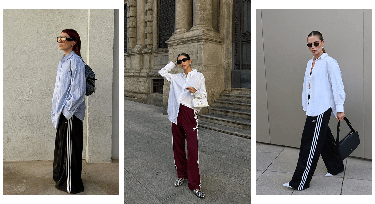 Черные или другие темные спортивные штаны с белыми лампасами стилисты советуют использовать для создания расслабленного образа со светлой оверсайз-рубашкой. Носить вещь лучше навыпуск, а в качестве первого слоя можно использовать топ или майку-алкоголичку.