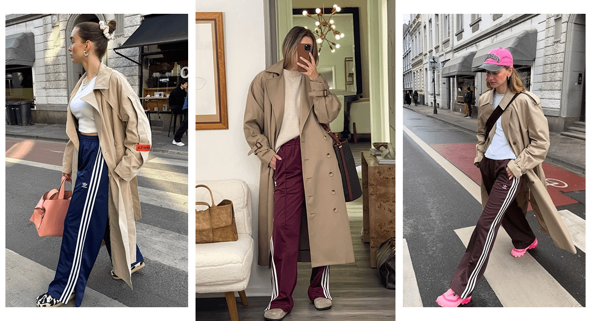 Широкими и прямого кроя спортивными штанами также можно заменить джинсы, которые часто используют для создания повседневного образа с тренчем. Спортивки не только более комфортные и не стесняют движения, но и выглядят гораздо интереснее.