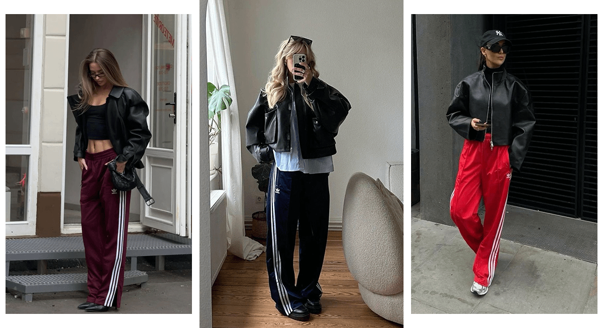 Впиши яркие спортивные штаны в образ с кожаной курткой