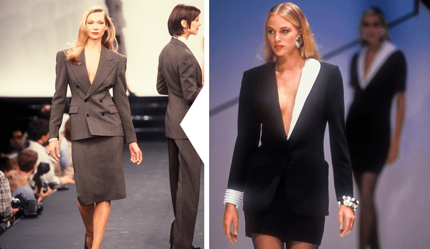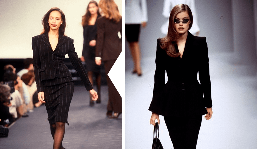 В этом сезоне в тренде женские костюмы в стиле 90-х. Их особенность в том, что они сочетают в себе классический и женственный стиль. Этот эффект создается благодаря тому, что костюм подчеркивает фигуру. Особенно область талии и ягодиц.