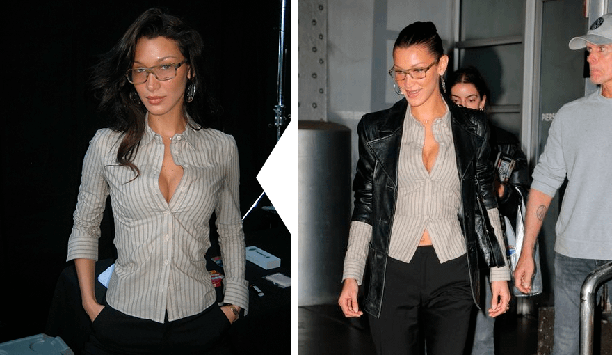 На создание этого образа можешь вдохновиться одним из аутфитов Беллы Хадид. Модель сочетает блузку в полоску с черными брюками, слегка зауженными к низу. Сексуальности образу придает оголенное декольте. Расстегни несколько верхних пуговиц и слегка отведи ворот, чтобы оголить ключицы.