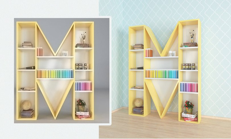 Интересное решение в дизайне детской комнаты — стеллаж в форме начальной буквы имени ребенка. Стеллажи очень вместительны и удобны в использовании. Конструкцию удобно использовать для хранения книг и игрушек, которые будут стоять на виду.