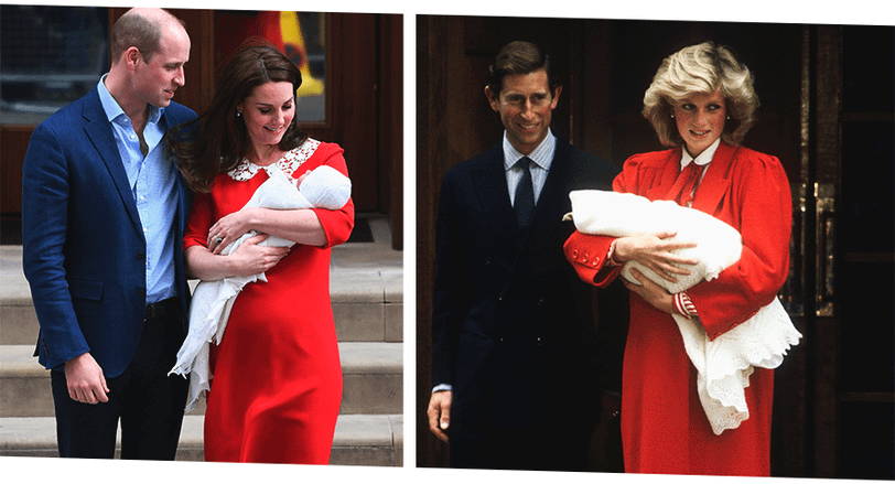После рождения принца Луи Кейт снова появилась в наряде, отсылающем к одному из образов Дианы – красном платье с белым воротником.