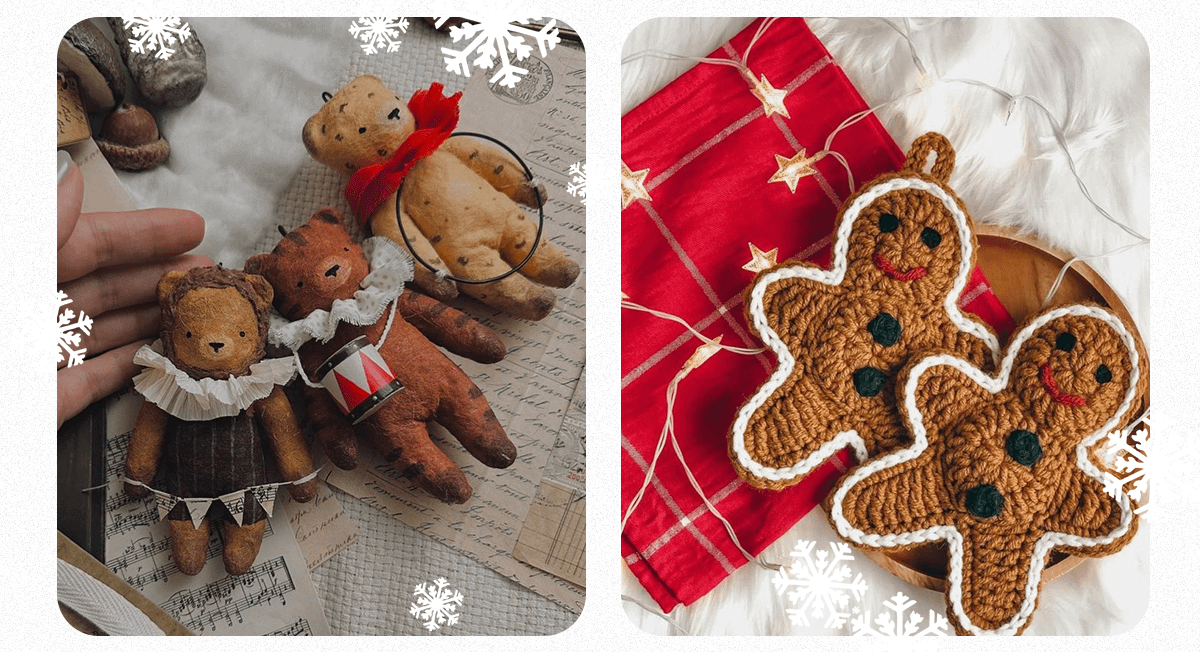 Свяжите крючком пряничных человечков или елочку, сделайте открытку из цветной бумаги. Вы также можете запастись клеем и бумагой, чтобы изготовить яркие игрушки из папье-маше.