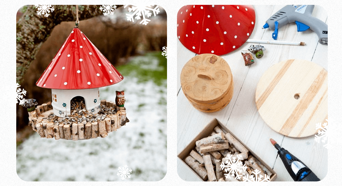 Ты также можешь купить готовую деревянную кормушку и украсить ее вместе с малышом. Не забудьте насыпать в нее немного корма и повесить на дереве у дома.