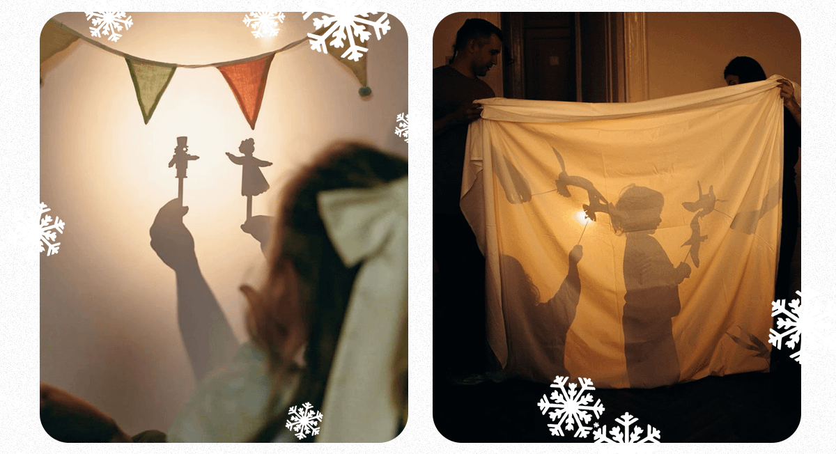 Сделать театр теней не так сложно. Для этого понадобится белая простынь, лампа с теплым светом и несколько бумажных персонажей. В качестве реквизита также можно использовать мягкие игрушки и гирлянду.