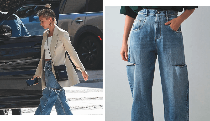 Например, одна из самых стильных девушек на Западе Хейли Бибер предпочитает очень широкие джинсы на низкой талии и с разрезами по бокам. Модель сочетает их в одном образе с базовым пиджаком, белым топом и небольшой сумкой через плечо.