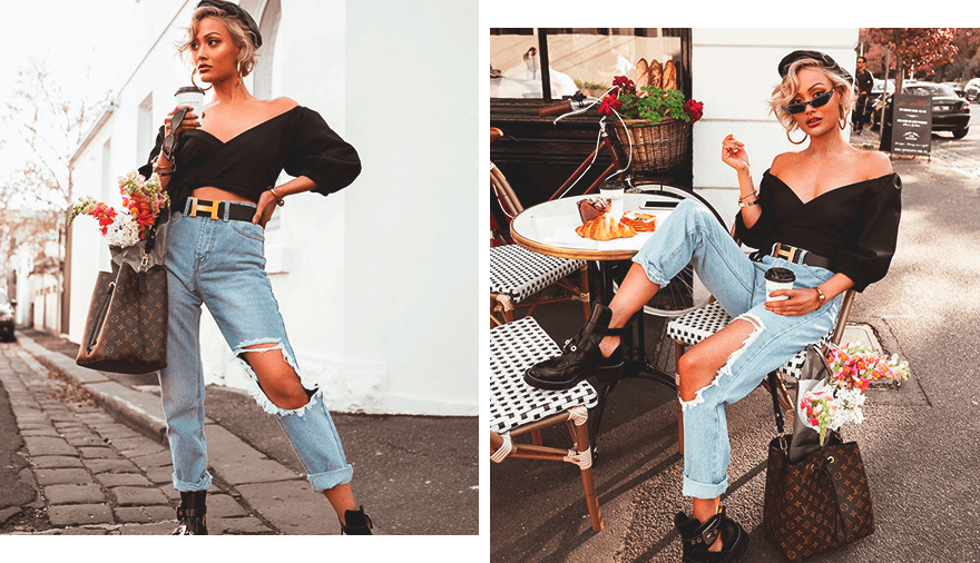 Джинсы-бойфренды — универсальная модель, которая хорошо подходит девушкам любого роста и типа фигуры. В жаркое время года актуальны модели с небольшими потертостями и аккуратными дырками на уровне колен или чуть выше. Сочетать такие джинсы можно как с грубыми ботинками или массивными кроссовками, так и более женственной обувью на каблуках.