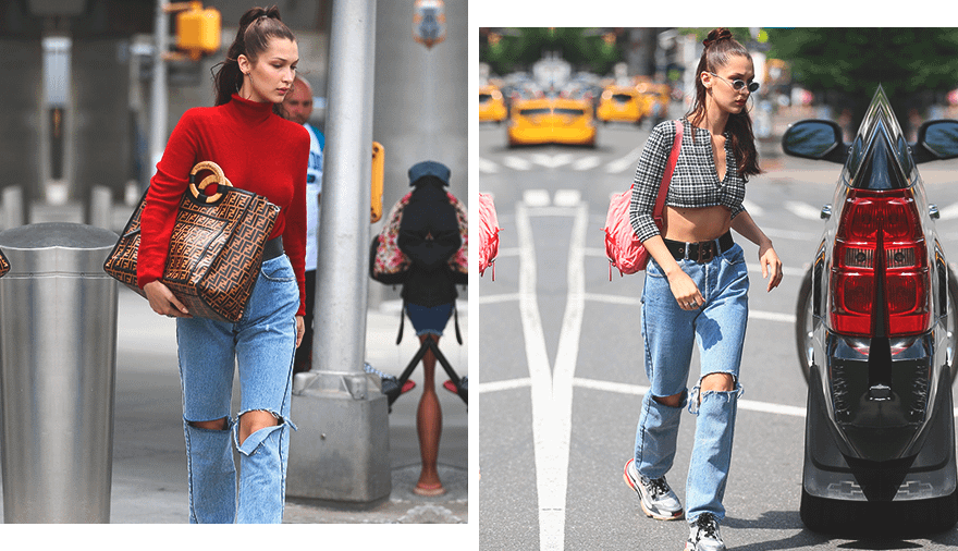 Модель Белла Хадид — одна из тех, кто очень любит стиль нулевых и умеет грамотно вписывать винтажные вещи в свой гардероб. Классические голубые джинсы с широкими разрезами на уровне колен модель сочетает в одном образе с ярко-красной трикотажной водолазкой и широким ремнем. Так она не только дополнительно подчеркивает талию, но и создает лаконичный, но при этом элегантный и стильный образ. Вдохновляйся ее примером, если тоже хочешь выглядеть просто, но со вкусом.