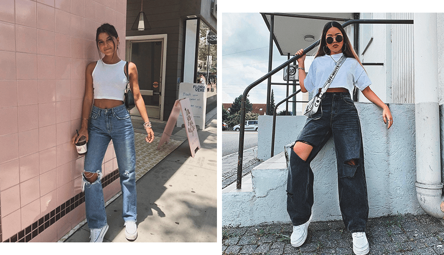 Если хочешь купить рваные джинсы, обязательно обрати внимание на эту модель. Джинсы-трубы с разрезами идеально впишутся в образ с обтягивающим топом, майкой-алкоголичкой и широкой рубашкой, надетой нараспашку.