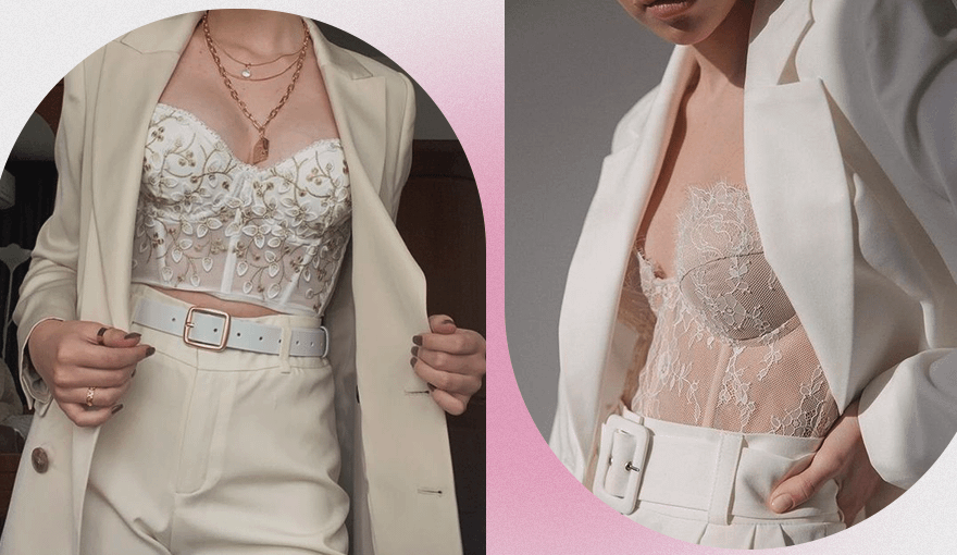 Еще один способ создать стильный летний образ в классическом стиле — надеть корсетный топ под базовый блейзер свободного кроя. Для создания аутфита подойдут как однотонные атласные корсеты, так и более нарядные кружевные модели. Важно, чтобы оттенок топа был одной температуры с оттенком костюма. И не забудь об аксессуарах — актуальных массивных кольцах, жемчужной подвеске или крупных серьгах.
