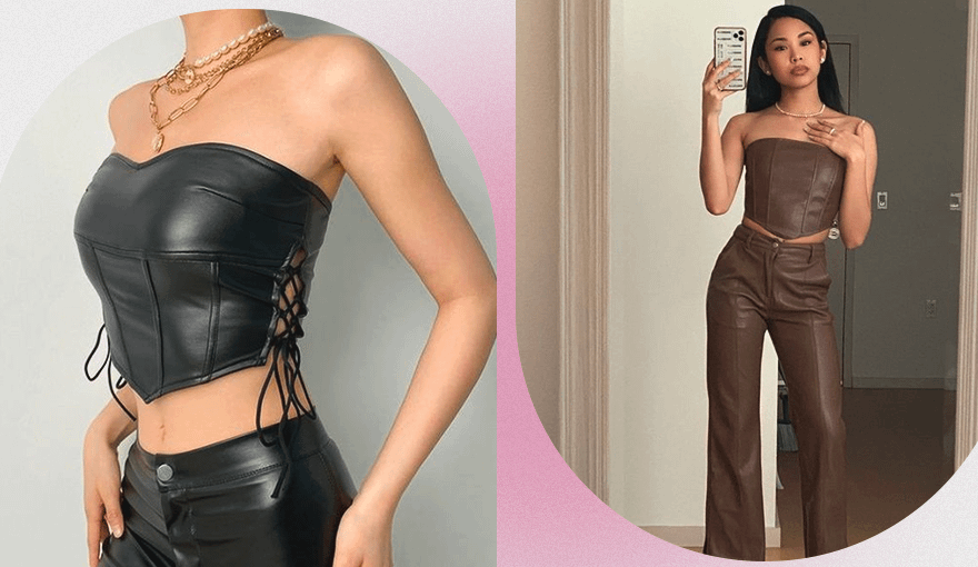 Лучше всего эта модель корсетного топа сочетается с кожаными брюками. Образ с использованием этих вещей выглядит и дерзко, и эстетично. В качестве аксессуаров можешь использовать массивное колье. Если планируешь собрать волосы, надень крупные серьги.