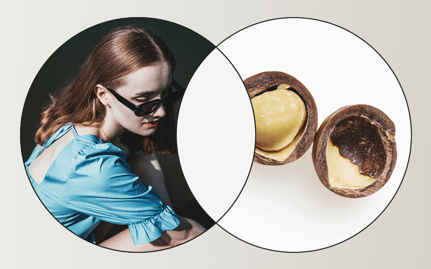 В масле макадамии также есть много жирных кислот, токоферолы и сквален. Первые делают волосы упругими. Вторые обладают антиоксидантными свойствами, которые защищают волосы от повреждений. Сквален — защитное вещество в кожном сале, которое обеспечит защиту от ультрафиолета.