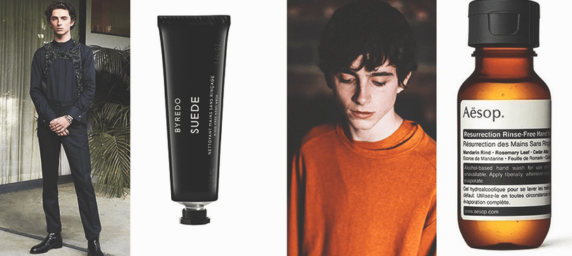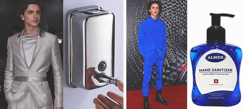 В серии коллажей Вэсп сопоставил образы Шаламе с красных дорожек с самыми востребованными флаконами санитайзеров. Например, Тимоти в черном костюме Louis Vuitton Портис сравнил с тюбиком Byredo.