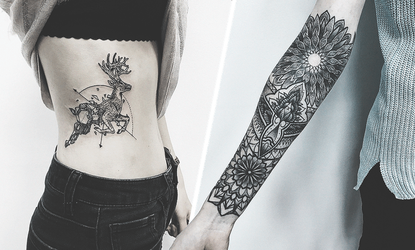 Сначала пробовала работать в разных стилях, чтобы понять, к чему лежит душа. Мне приходилось бить и old school, и акварель, и графику. Примерно через два года после старта поняла, что хочу работать только в черной татуировке. Сейчас мои любимые стили – графика, орнаментал, геометрия. Они привлекают меня четкостью линий и многообразием форм.