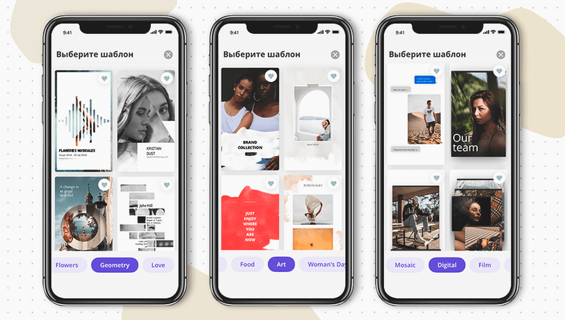 Красивое визуальное оформление особенно приветствуется. Оно повышает шанс отклика на пост, в том числе в виде лайков, комментариев и подписок. В этом, опять же, тебе сможет помочь Instories. Бонус: шаблоны в приложении сгруппированы по разным стилям, что позволит тебе без труда создавать креативный контент для нескольких аккаунтов.