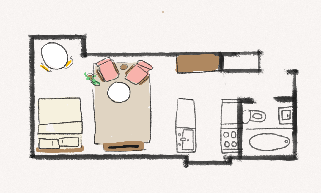 2. Небольшой столик должен стоять в углу как отдельная зона для завтрака и ужина.