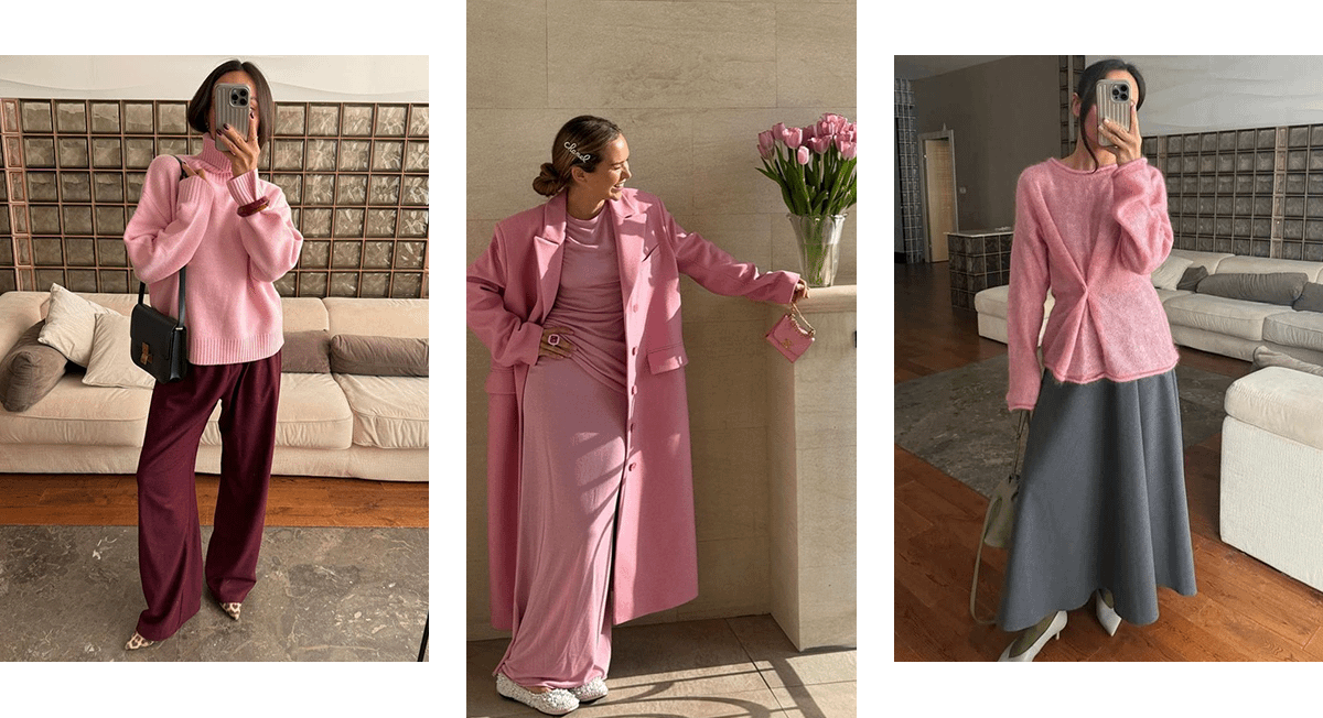 Primrose Pink — это мягкий и романтичный оттенок розового, который ассоциируется с женственностью и любовью. Если задача — создать роскошный образ, розовый стоит «скрестить» с бордовым, хаки или серым оттенком. Более нежно выглядят аутфиты total pink.