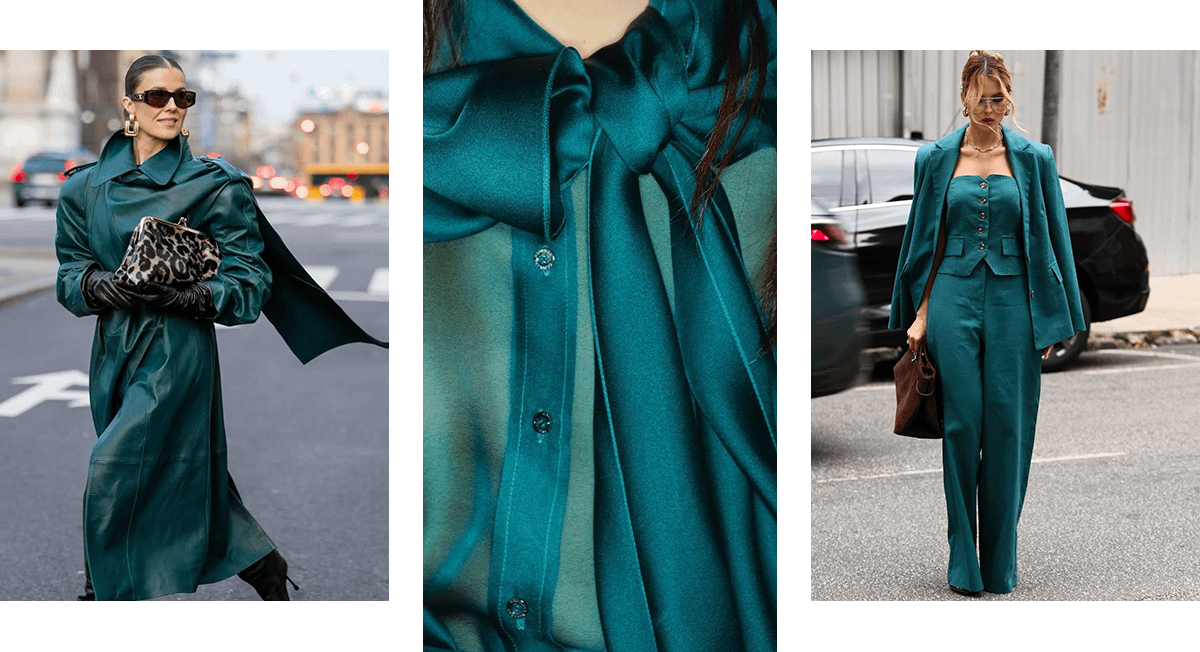 Lyons Blue — томный сине-зеленый оттенок ассоциируется с надежностью и внутренней стойкостью, делает образы аристократичными и утонченными. Сложный оттенок выигрышно смотрится в паре с белоснежным, винным и темно-коричневым цветами. Также «Лионский синий» сочетается с графитово-серым и металликом — образы приобретают урбанистический характер.