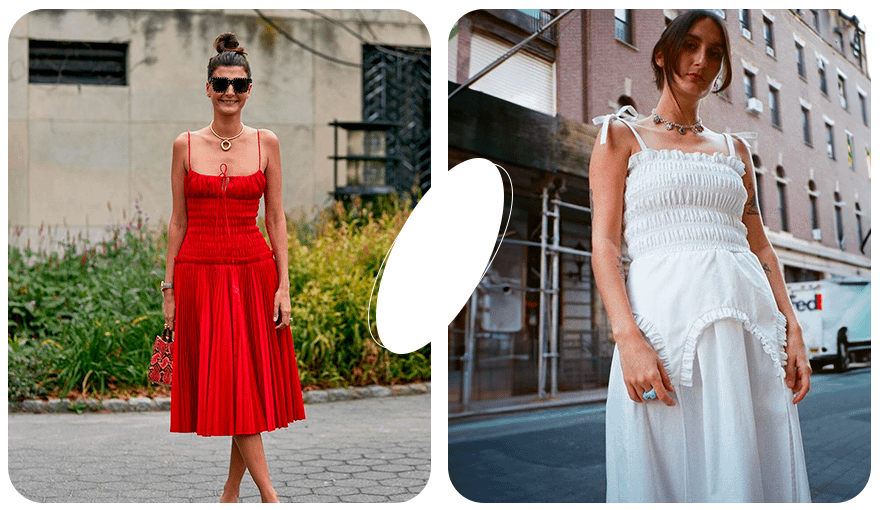 Если тебя вдохновляет эстетика нулевых, носи сарафан с резиновыми нитками в одном образе с винтажными украшениями. Например, массивным золотистым колье или джинсовой сумкой-багетом. Завершить образ советуем босоножками на высоком тонком каблуке и солнцезащитными очками с широкой оправой.