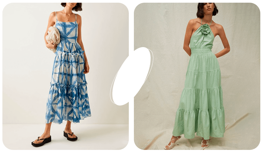 Еще один тренд этого лета — сарафаны с юбками, расширяющимися к низу несколькими ярусами. В моде и однотонные модели, и яркие сарафаны, украшенные вышивкой или драпировкой.