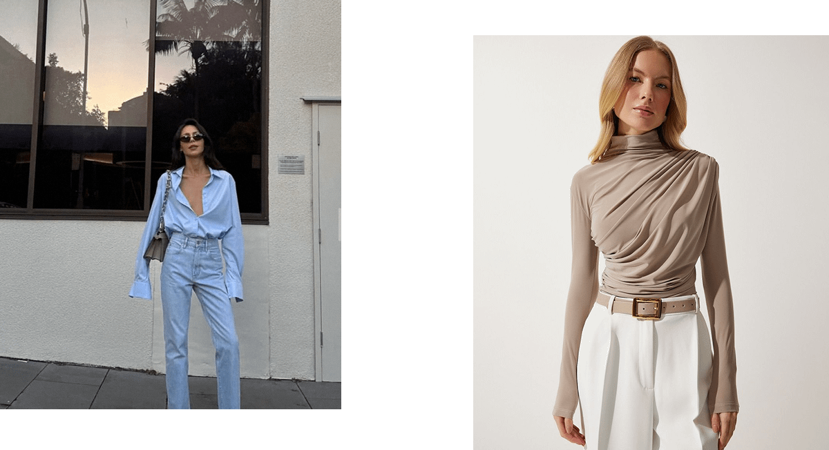 На смену антитренду пришли блузки обтягивающего кроя с базовыми длинными рукавами. Они могут быть дополнены драпировкой, но не слишком яркой. Все так же в моде остаются и базовые голубые рубашки в полоску. Самые «безопасные» — те, что лишь слегка объемные.