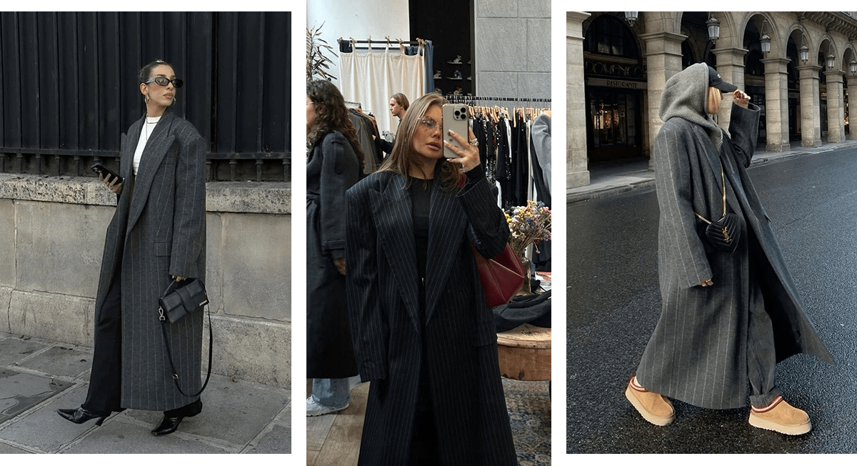 Еще один тренд этой осени — шерстяные удлиненные пальто. Особенно актуальны классические модели в сером цвете, дополненные тонкими полосами. Такая одежда хорошо подходит для создания классического образа и аутфита в стиле кэжуал с использованием платья или широких брюк.