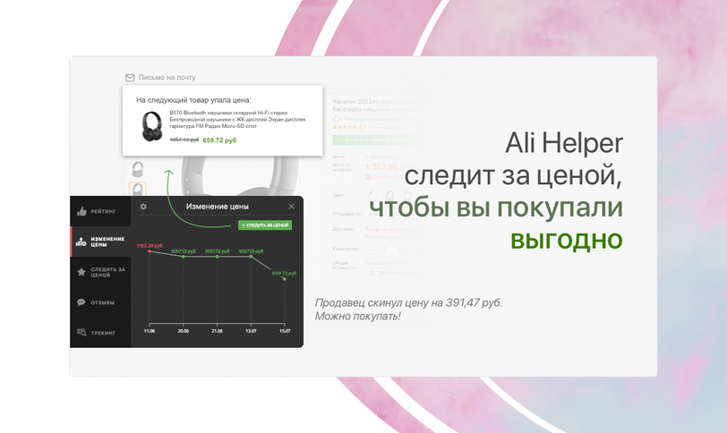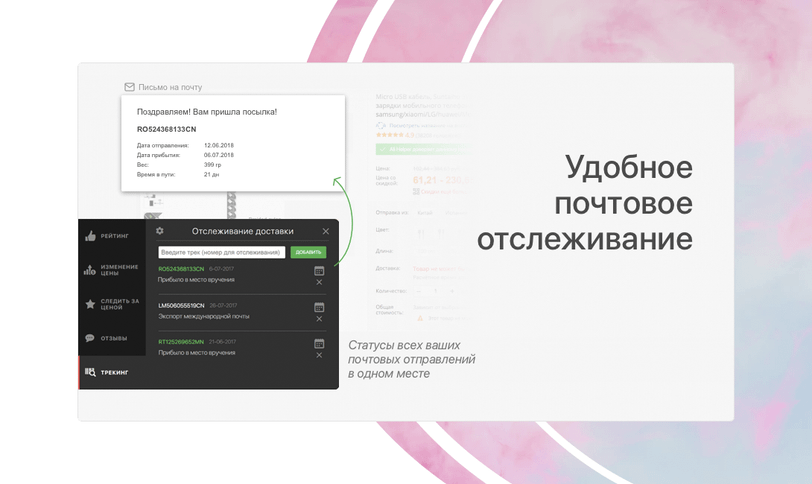 Почему стоит пользоваться: Расширение позволяет быстро просмотреть ключевые характеристики товара, отзывы покупателей и степень надежности продавца. Сохраняй понравившиеся товары в избранное и получай уведомления о снижении цен, сравнивай цены на аналогичные товары и выбирай минимальную стоимость. Ты сможешь без проблем отслеживать покупку на протяжении всего времени следования. Кроме того, Ali Helper совместим с популярными кэшбэк-сервисами, что позволяет экономить еще больше, дополнительно возвращая часть средств с покупки себе на карту.