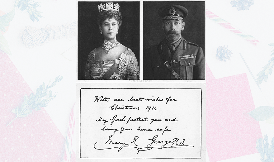 Открытки со сценами из жизни британской королевской семьи появились еще при королеве Виктории, однако тогда их печатали неофициально. Первую рождественскую открытку от своего имени отправил внук Виктории король Георг V в 1914 году, чтобы поддержать британских военных, сражающихся на фронте.