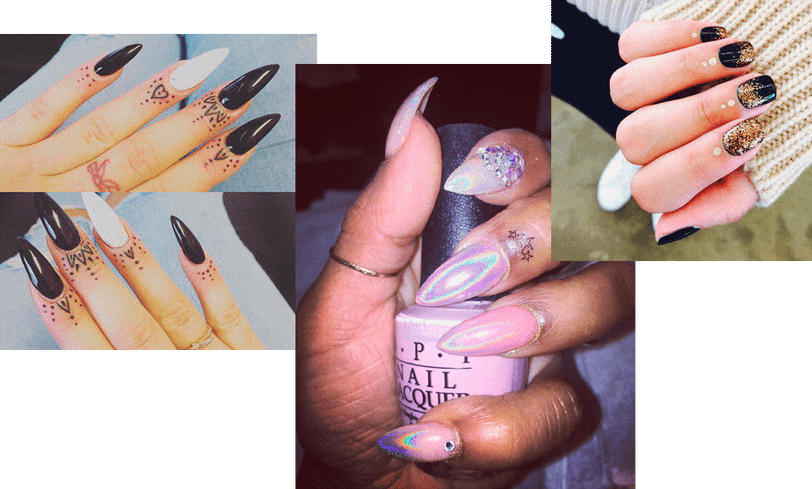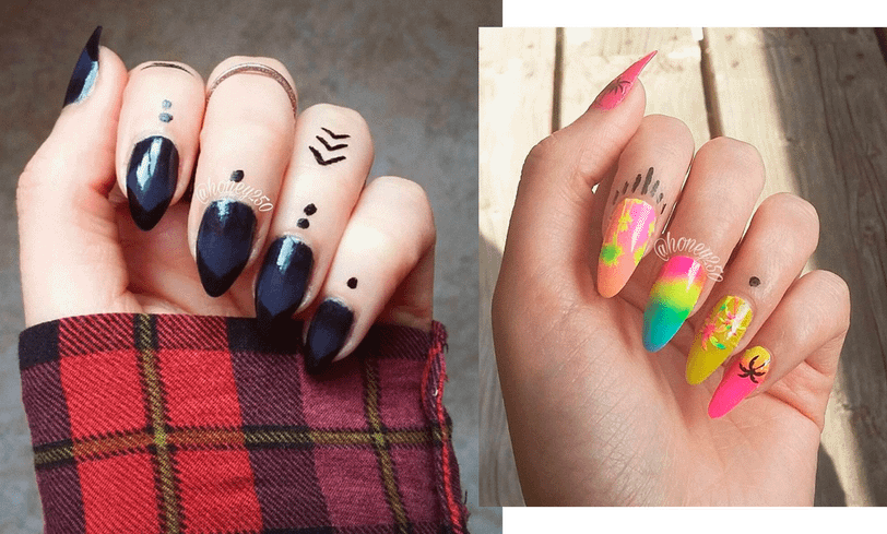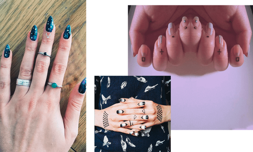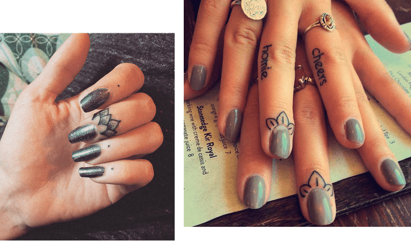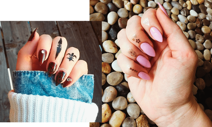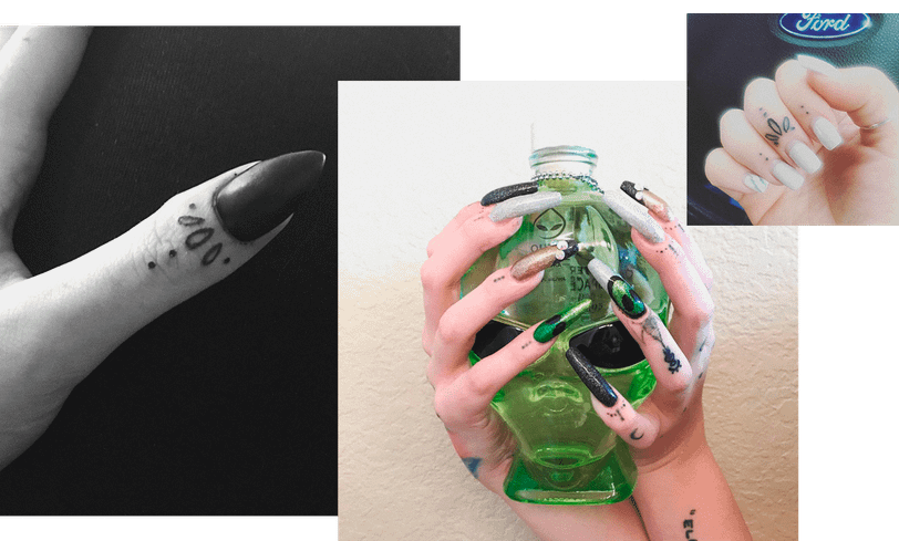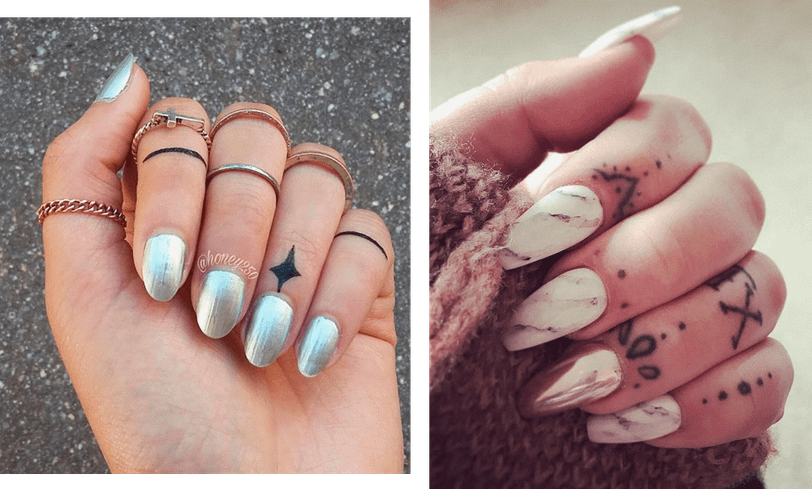 Татуировки на кутикулах позволяют подчеркнуть и дополнить твой маникюр. Композиция может быть абсолютно любой: и крохотные точки, и даже растянутая на весь палец графика.